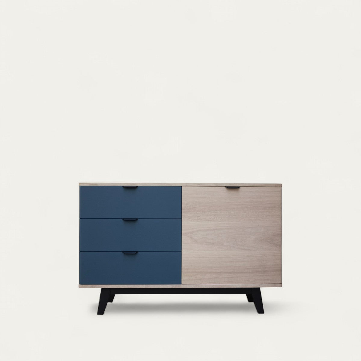 3 midnight blue lacquered drawers and 1 oak door. Black metal “spout” handle.