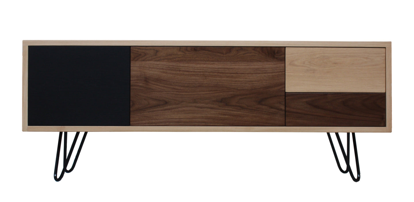 Buffet TV chêne et noyer massif 1 porte 1 abattant 2 tiroirs